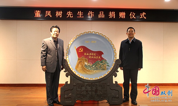 2021年3月17日,为庆祝中国共产党建党100周年,由当代著名书法家董凤树先生精心创作的“纪念宝盘”捐赠仪式在中国历史第一档案馆举行。中央档案馆原副馆长、国家档案局原副局长沈正乐、河北工人报《公益周刊》主编王振峰出席了捐赠仪式。