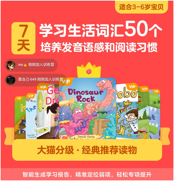 以大猫分级的经典读物(由英国著名分级阅读教育专家Cliff Moon主持编写,世界各地著名儿童作家和插画家共同打造;为4-15岁中国少年儿童家庭英语阅读提供全面解决方案)为例,课程总共包含7本绘本和50个生活词汇。旨在培养孩子的发音语感和阅读习惯。