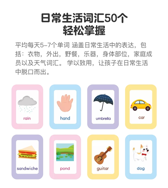 每天学习一本绘本,平均学习5-7个单词,涵盖生活中的日常表达。