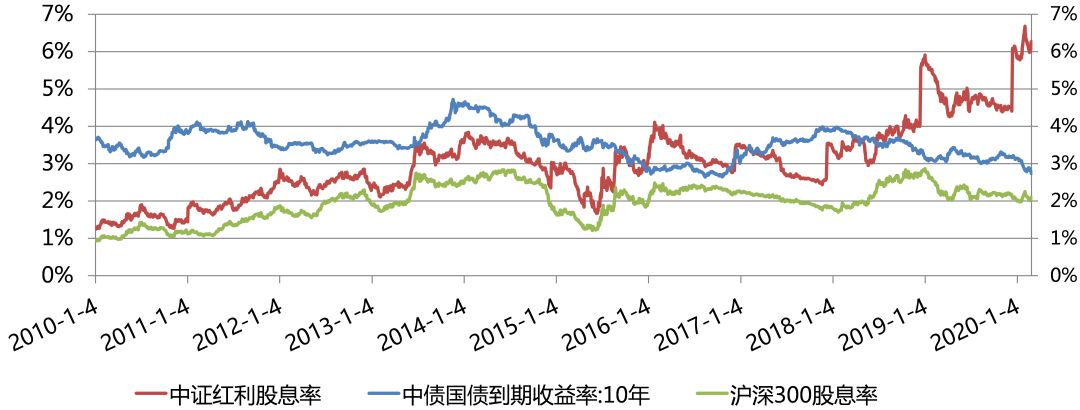 中证红利、沪深300股息率与10年期国债到期收益率对比图