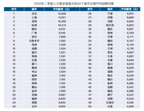 数据显示,2020年第二季度,人才需求量前50城白领平均招聘月薪为8190元,北京以12602元领跑全国,乌鲁木齐冲上第八位。