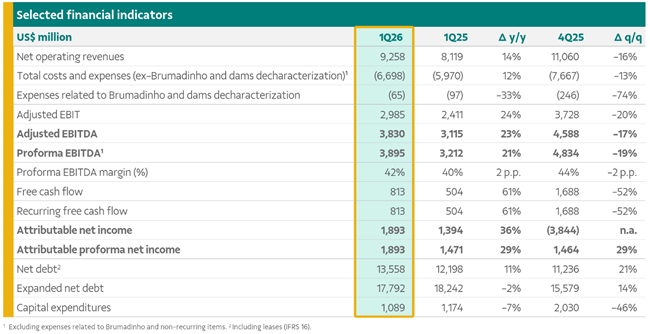 淡水河谷于今日发布了2026年第一季度财务报告。